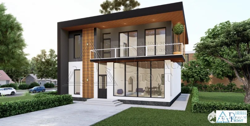 По проекту в доме будет три санузла, два на первом этаже и один на втором, четыре спальни, на первом этаже гостевая комната (12, 28 квадратных метров), на втором этаже три спальни (18, 46, 16, 22 и 23.83 квадратных метров). На первом этаже будет располагаться кухня-гостиная - 46, 08 квадратных метров, с окнами в пол.