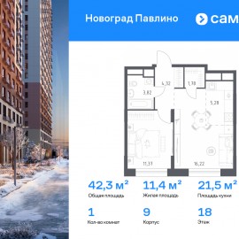 Строим кварталы для жизни с заботой о будущем. Предлагается 1-комнатная квартира комфорт-класса 42, 3 кв.м в корпусе 9 на 18 этаже, в ЖК «Новоград Павлино» Квартира с чистовой отделкой. Доступность дополнительных опций уточняйте у застройщика. Приобрести квартиру возможно по...