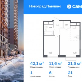 Строим кварталы для жизни с заботой о будущем. Предлагается 1-комнатная квартира комфорт-класса 42, 1 кв.м в корпусе 6 на 21 этаже, в ЖК «Новоград Павлино» Квартира с предчистовой отделкой. Доступность дополнительных опций уточняйте у застройщика. Приобрести квартиру...