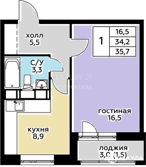 Общая площадь квартиры с учетом летних помещений 35, 7 кВ.м.