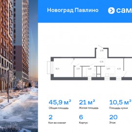 Строим кварталы для жизни с заботой о будущем. Предлагается 2-комнатная квартира комфорт-класса 45, 9 кв.м в корпусе 6 на 20 этаже, в ЖК «Новоград Павлино» Квартира с предчистовой отделкой. Доступность дополнительных опций уточняйте у застройщика. Приобрести квартиру...