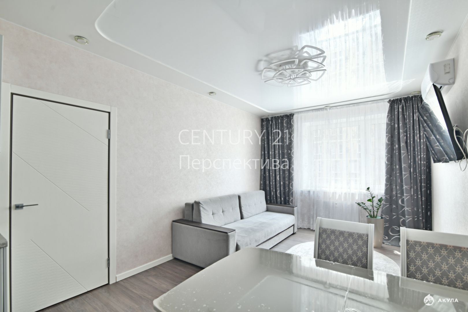 Светлая квартира с просторной жилой зоной и оборудованной кухней.