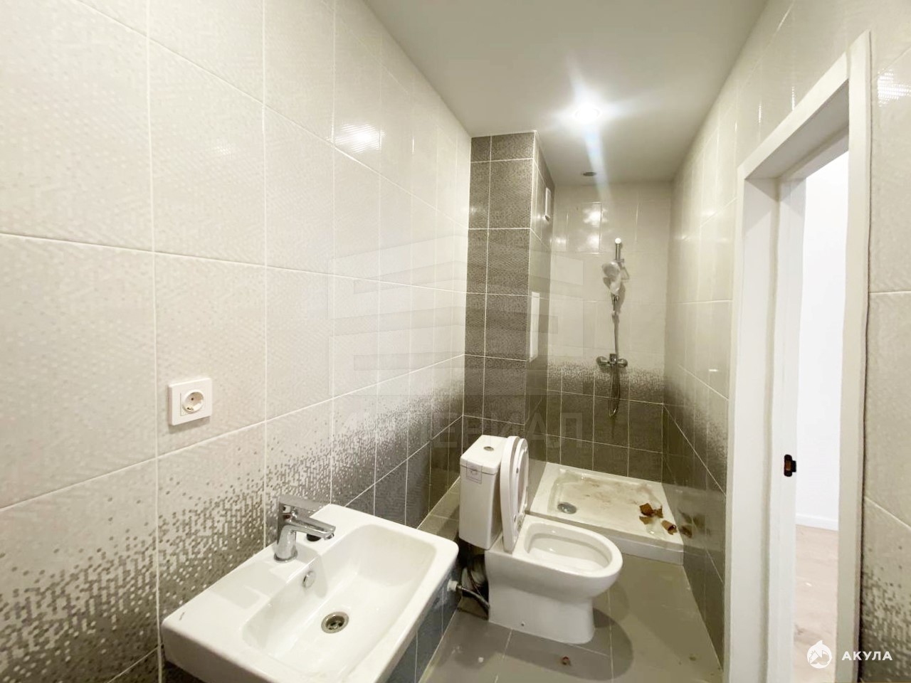 На стенах поклеены обои под покраску, на полу постелен ламинат с плинтусами и откосами. Есть вытяжная вентиляция в санузле и на кухне, выходы хв/гв, место под раковину на кухне. Кроме того, в помещениях уже есть выключатели освещения, розетки для бытовой техники и роутера, а также сделаны закладные для оптоволокна для интернета.