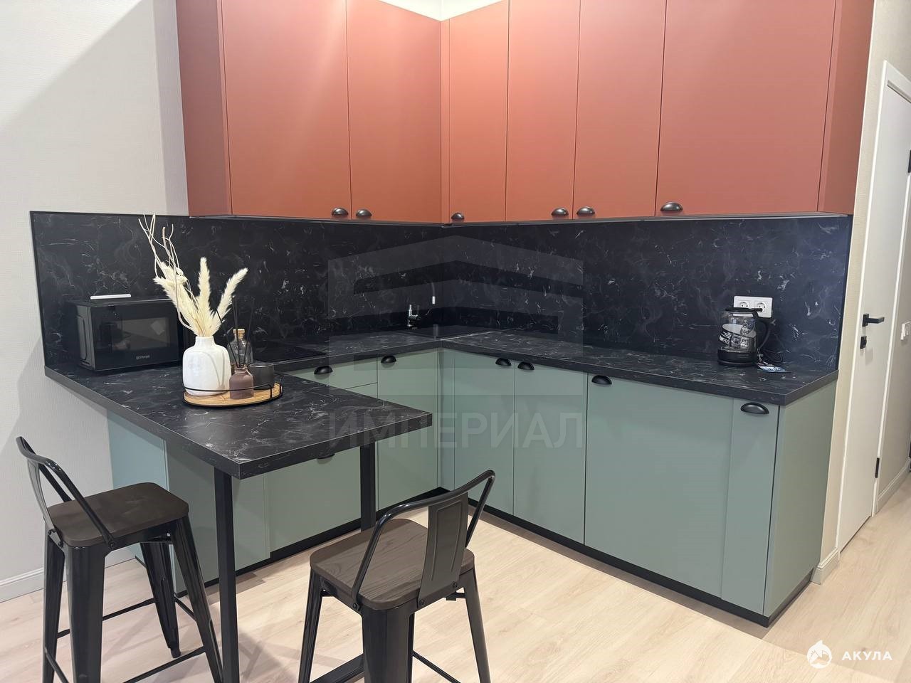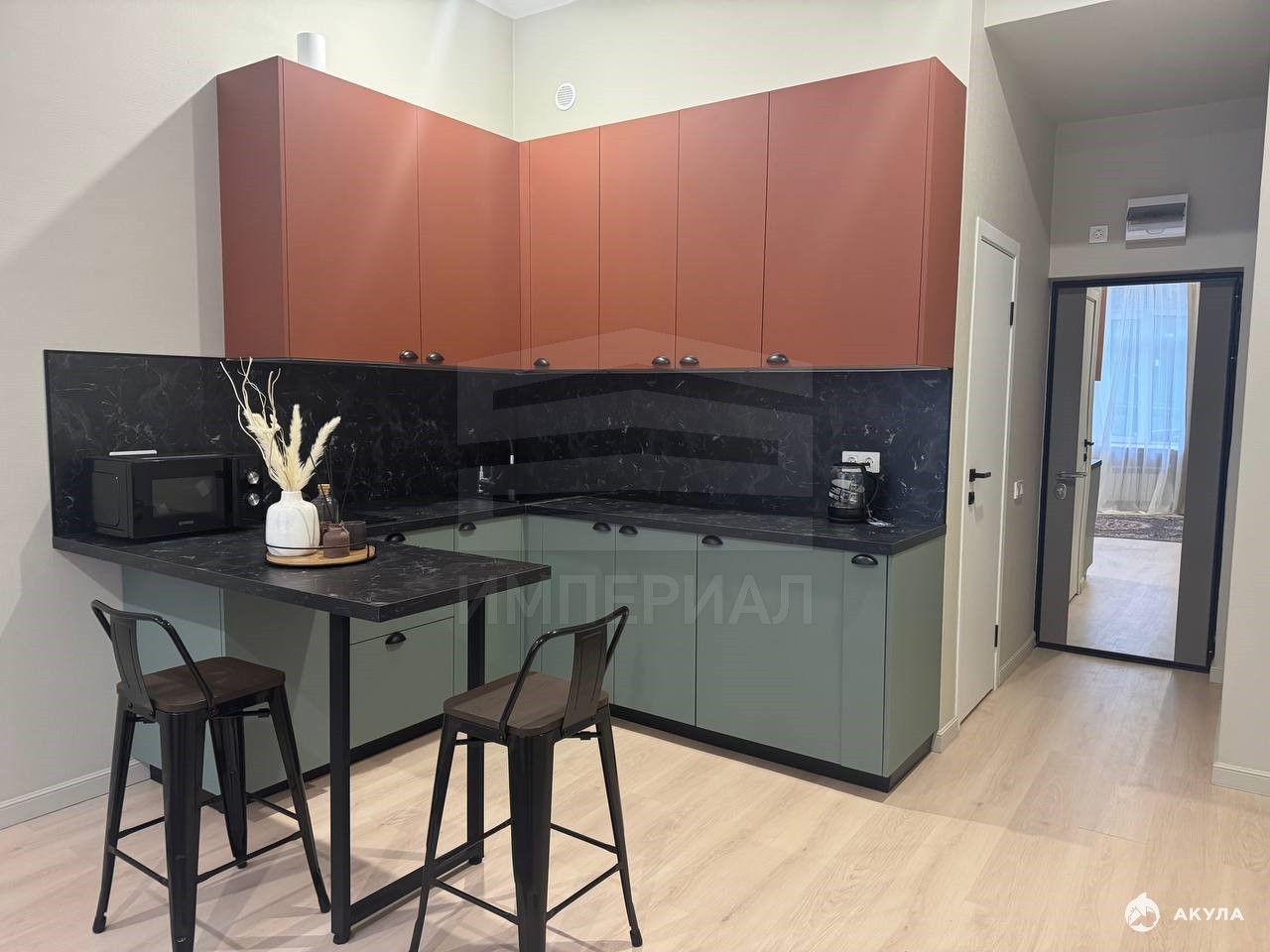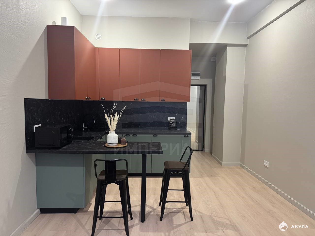 На стенах поклеены обои под покраску, на полу постелен ламинат с плинтусами и откосами. Есть вытяжная вентиляция в санузле и на кухне, выходы хв/гв, место под раковину на кухне. Кроме того, в помещениях уже есть выключатели освещения, розетки для бытовой техники и роутера, а также сделаны закладные для оптоволокна для интернета.