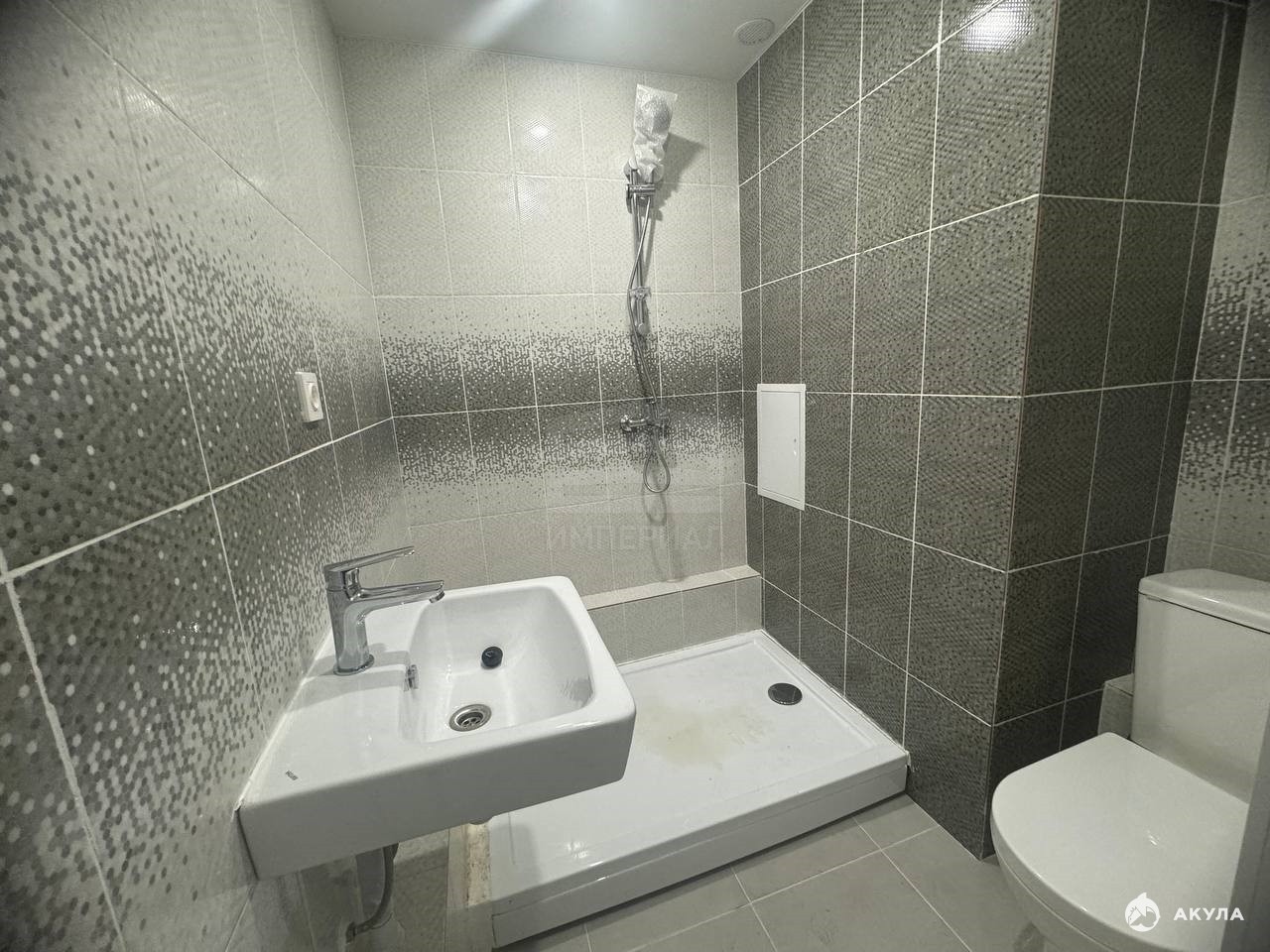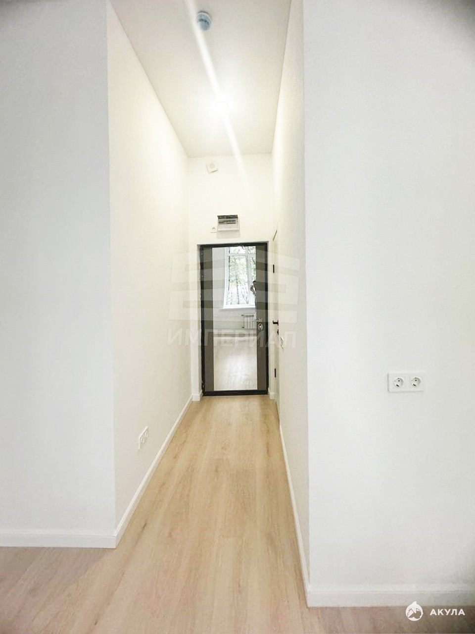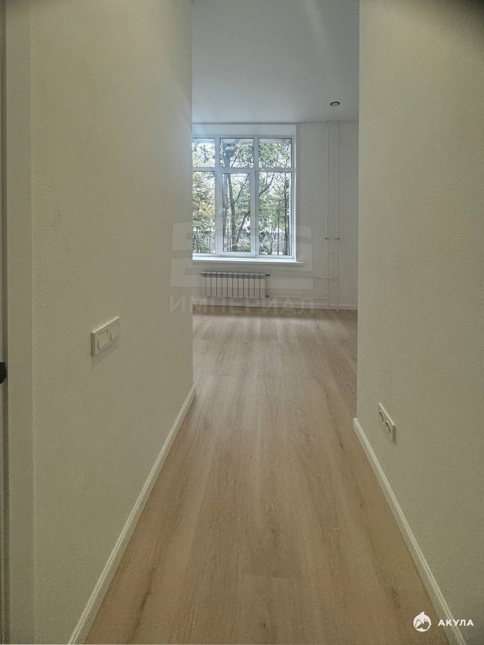 На стенах поклеены обои под покраску, на полу постелен ламинат с плинтусами и откосами. Есть вытяжная вентиляция в санузле и на кухне, выходы хв/гв, место под раковину на кухне. Кроме того, в помещениях уже есть выключатели освещения, розетки для бытовой техники и роутера, а также сделаны закладные для оптоволокна для интернета.