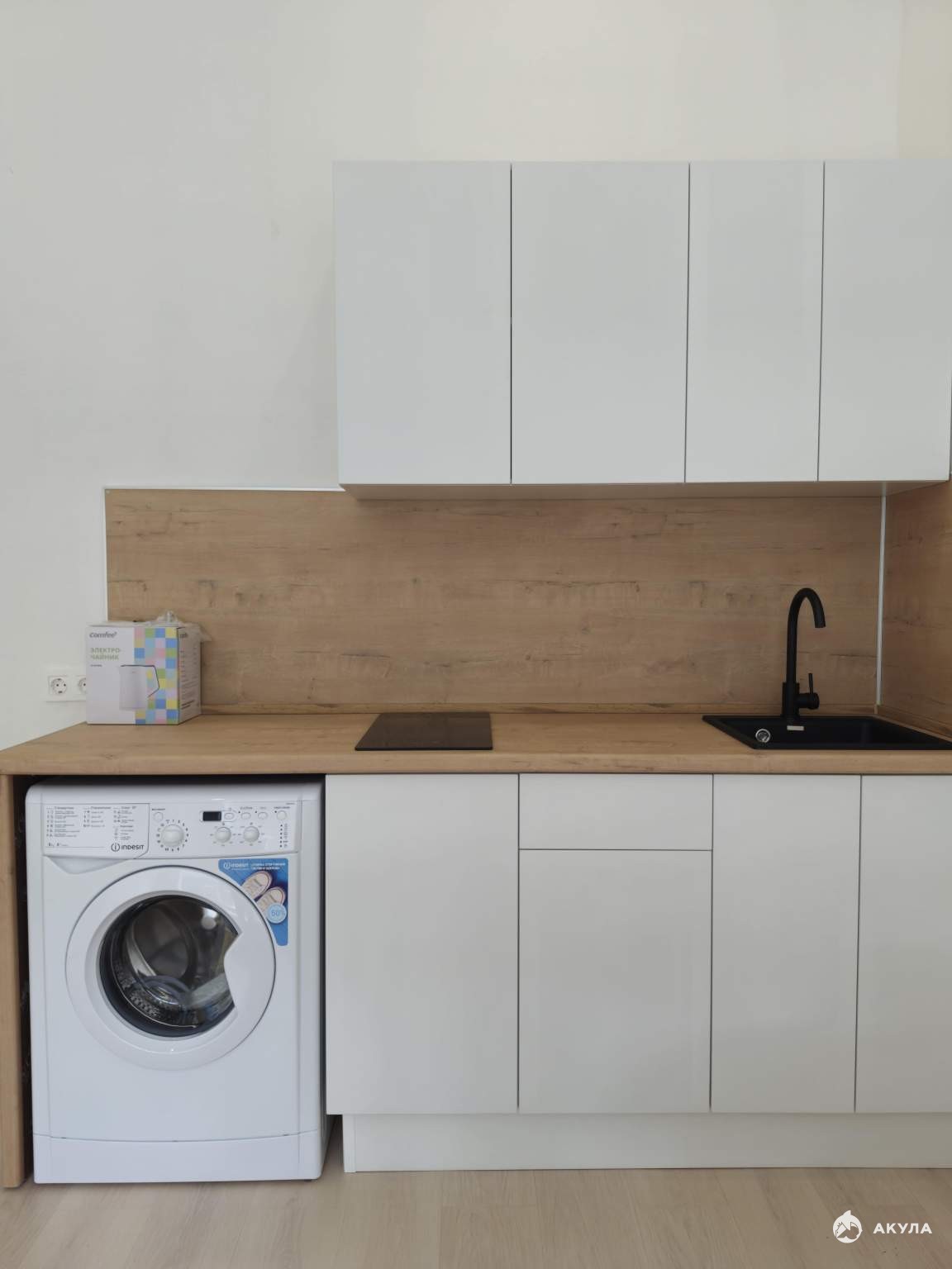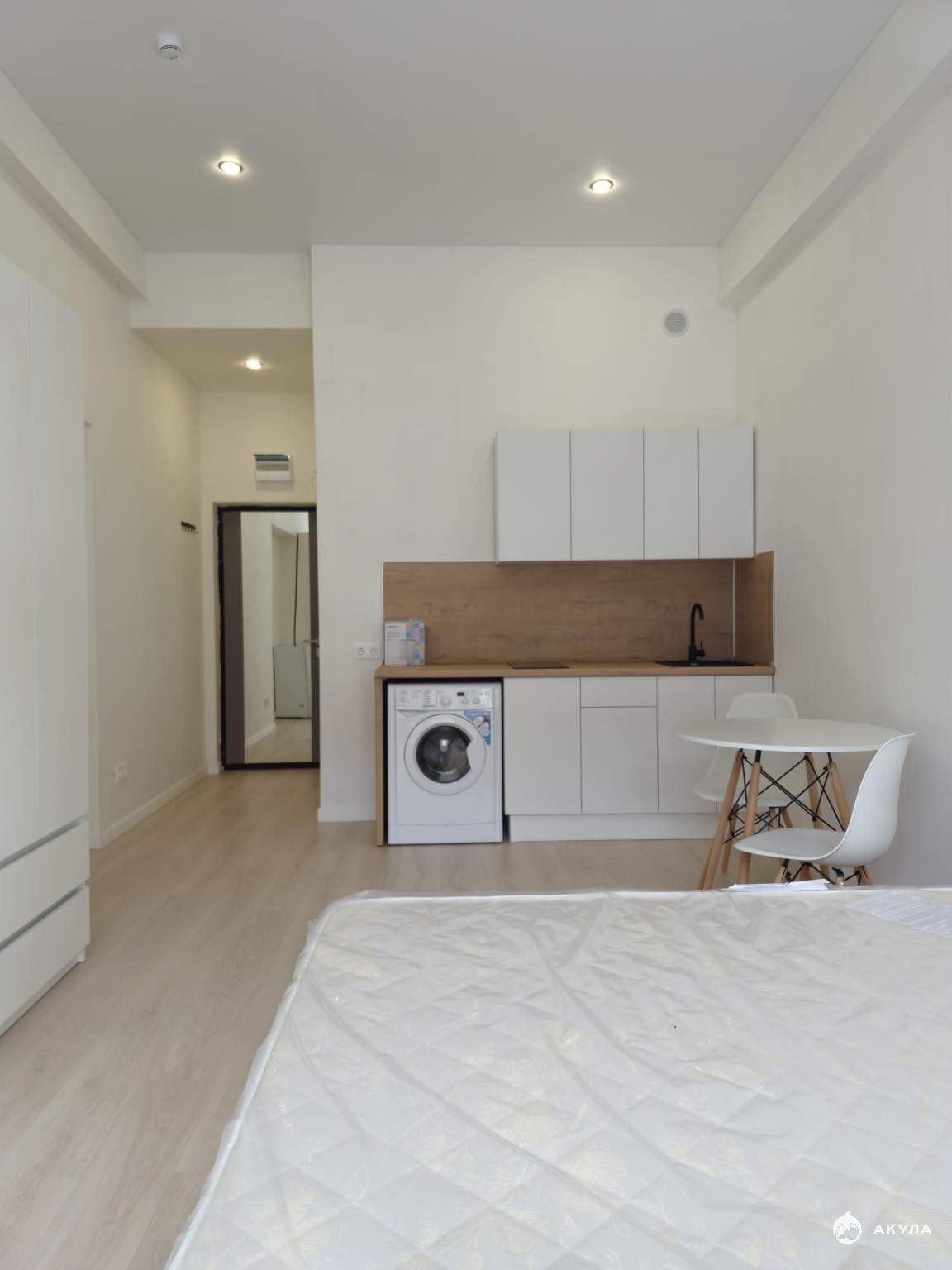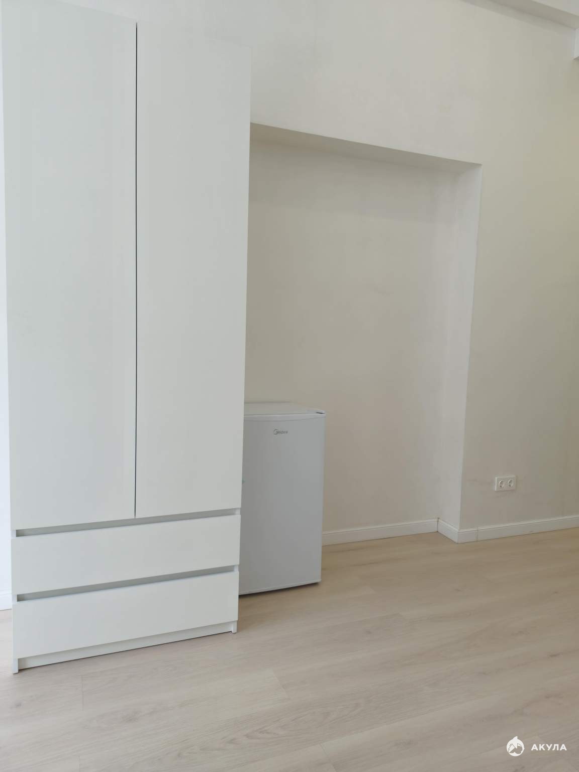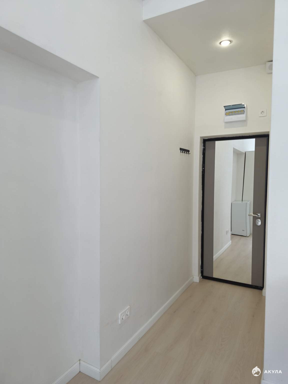 На стенах поклеены обои под покраску, на полу постелен ламинат с плинтусами и откосами. Есть вытяжная вентиляция в санузле и на кухне, выходы хв/гв, место под раковину на кухне. Кроме того, в помещениях уже есть выключатели освещения, розетки для бытовой техники и роутера, а также сделаны закладные для оптоволокна для интернета.