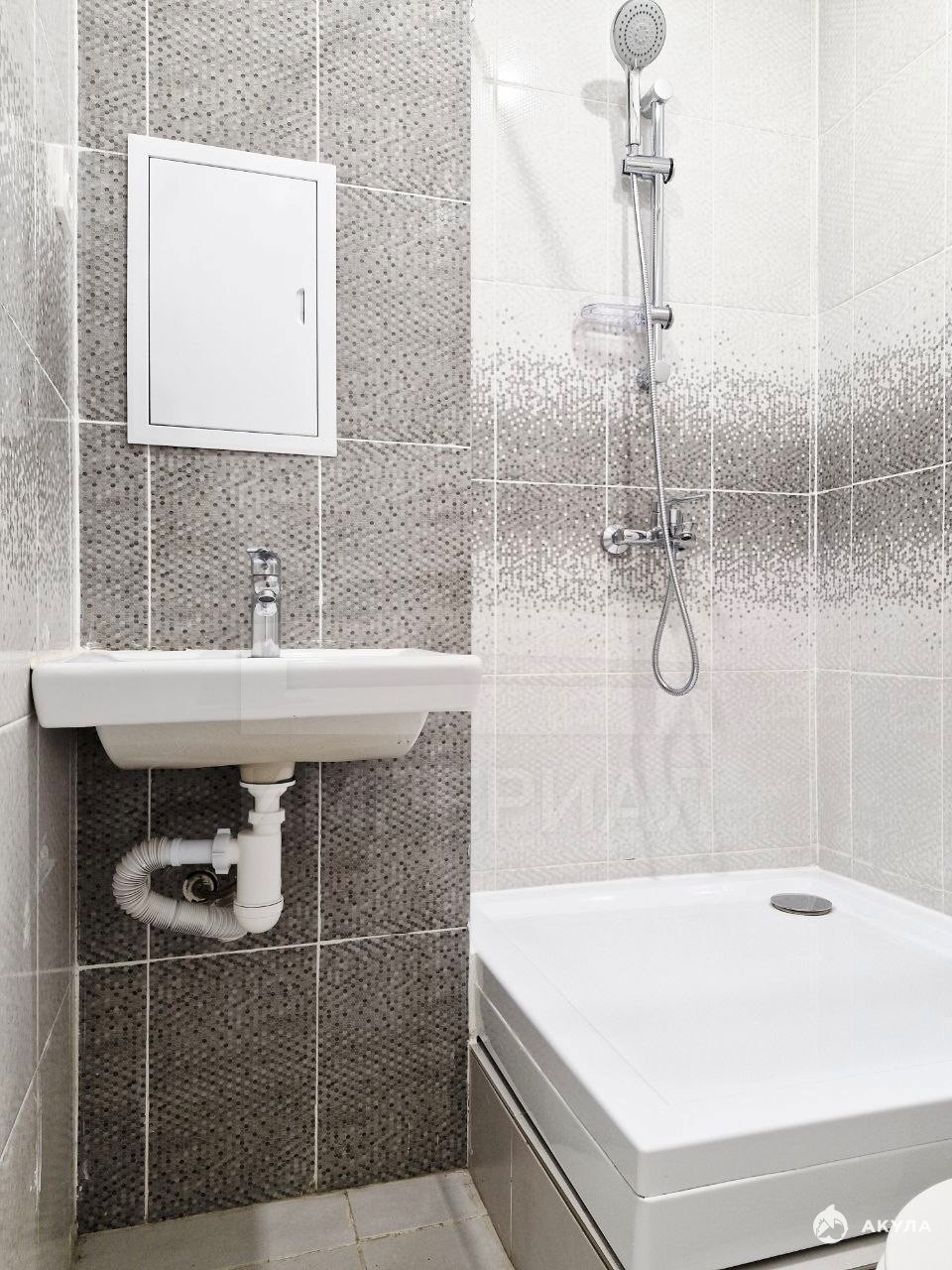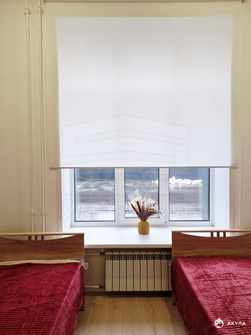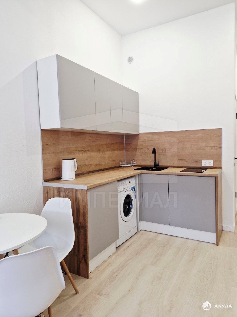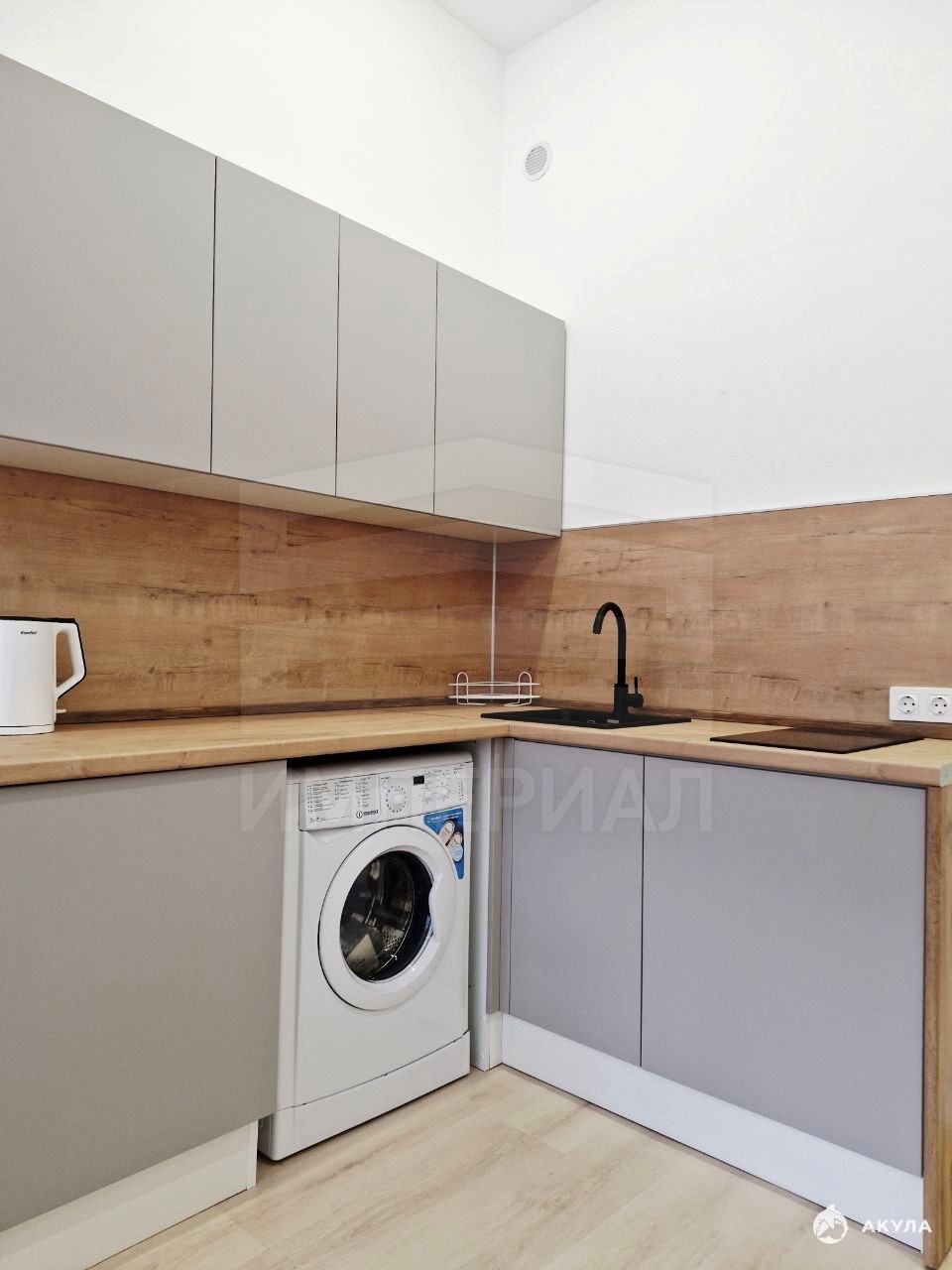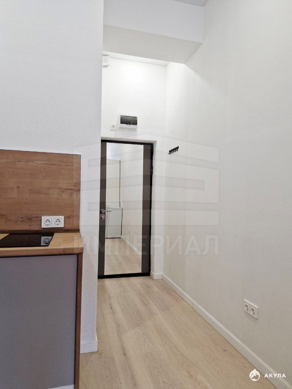 На стенах поклеены обои под покраску, на полу постелен ламинат с плинтусами и откосами. Есть вытяжная вентиляция в санузле и на кухне, выходы хв/гв, место под раковину на кухне. Кроме того, в помещениях уже есть выключатели освещения, розетки для бытовой техники и роутера, а также сделаны закладные для оптоволокна для интернета.