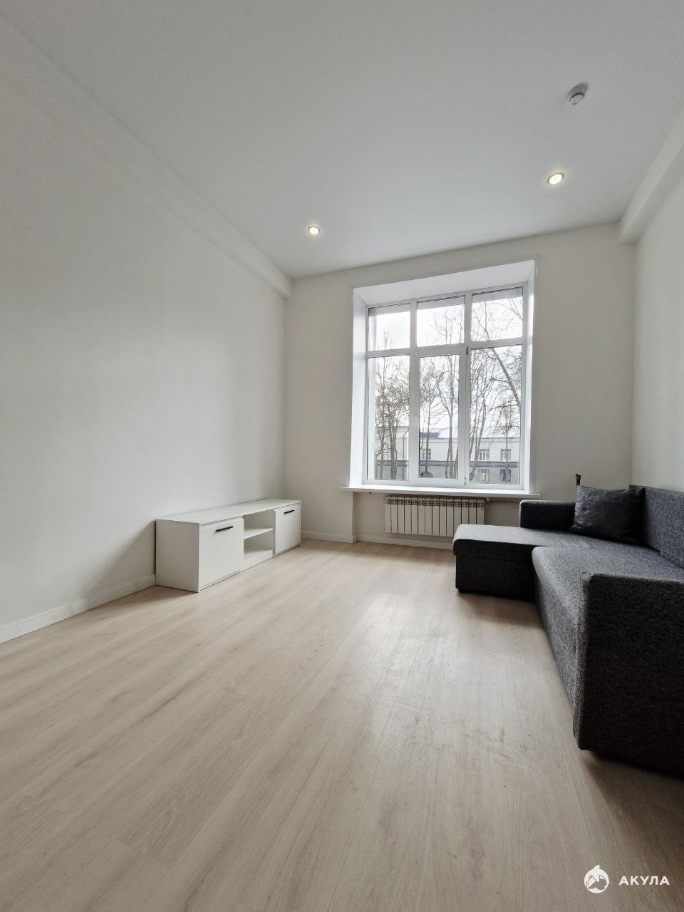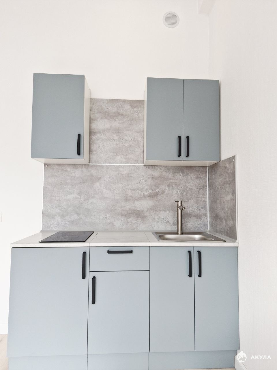 На стенах поклеены обои под покраску, на полу постелен ламинат с плинтусами и откосами. Есть вытяжная вентиляция в санузле и на кухне, выходы хв/гв, место под раковину на кухне. Кроме того, в помещениях уже есть выключатели освещения, розетки для бытовой техники и роутера, а также сделаны закладные для оптоволокна для интернета.